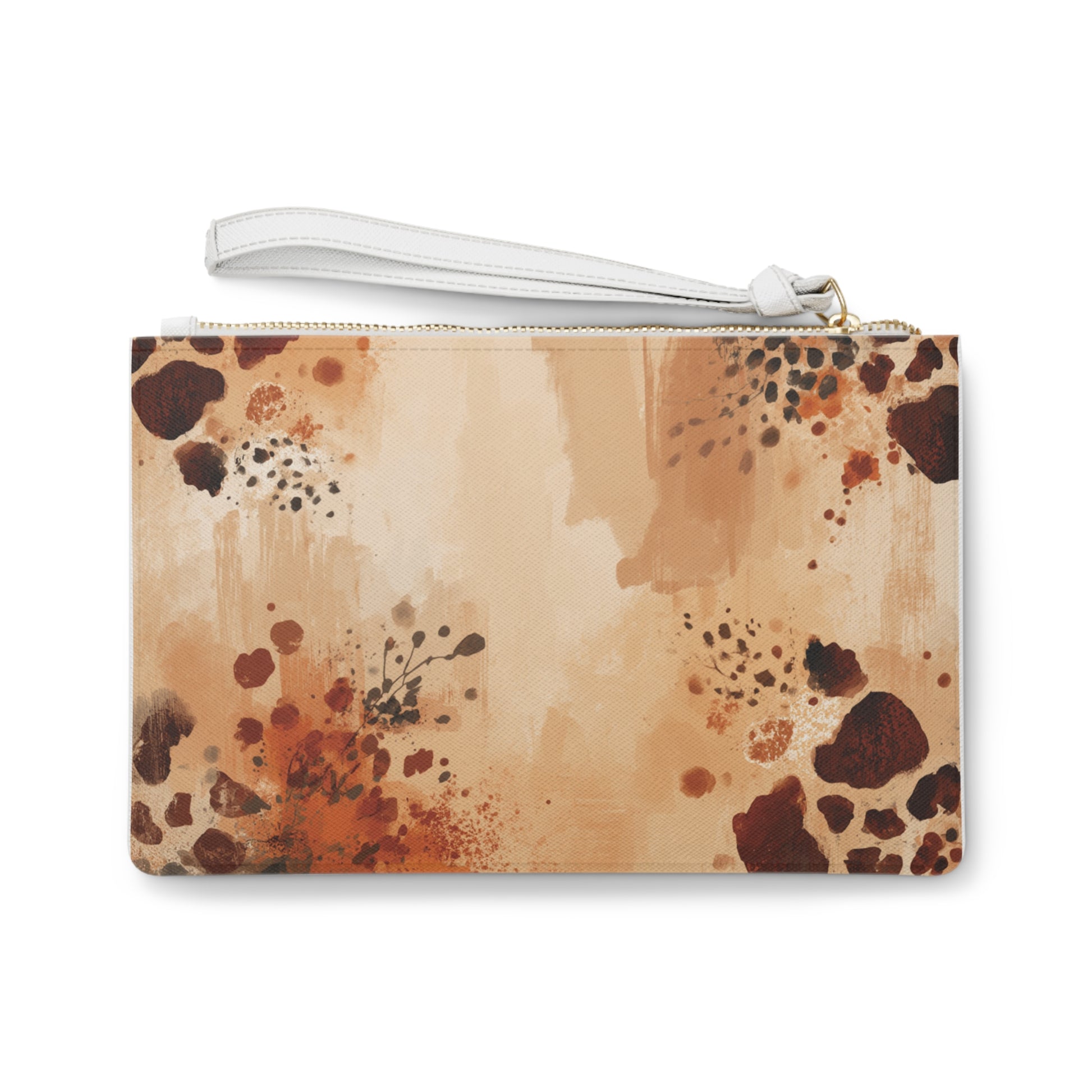 Lightweight and refined, this clutch brings soft watercolor warmth and a touch of wildness to everyday carry. Warm caramel washes blend with ink-like spots and subtle botanical specks, creating a lived-in, artisanal look that slips easily into a tote or becomes your go-to for a quick errand or coffee date. The saffiano-textured PU leather keeps the surface scratch-resistant while the gold metal zipper and white wrist strap add a bright, polished contrast. Inside, two compartments and a small pocket keep cards and lip balm organized, and the black lining hides everyday wear. Thoughtfully assembled in the USA from global parts, this clutch balances urban polish with a relaxed, nature-inspired spirit.